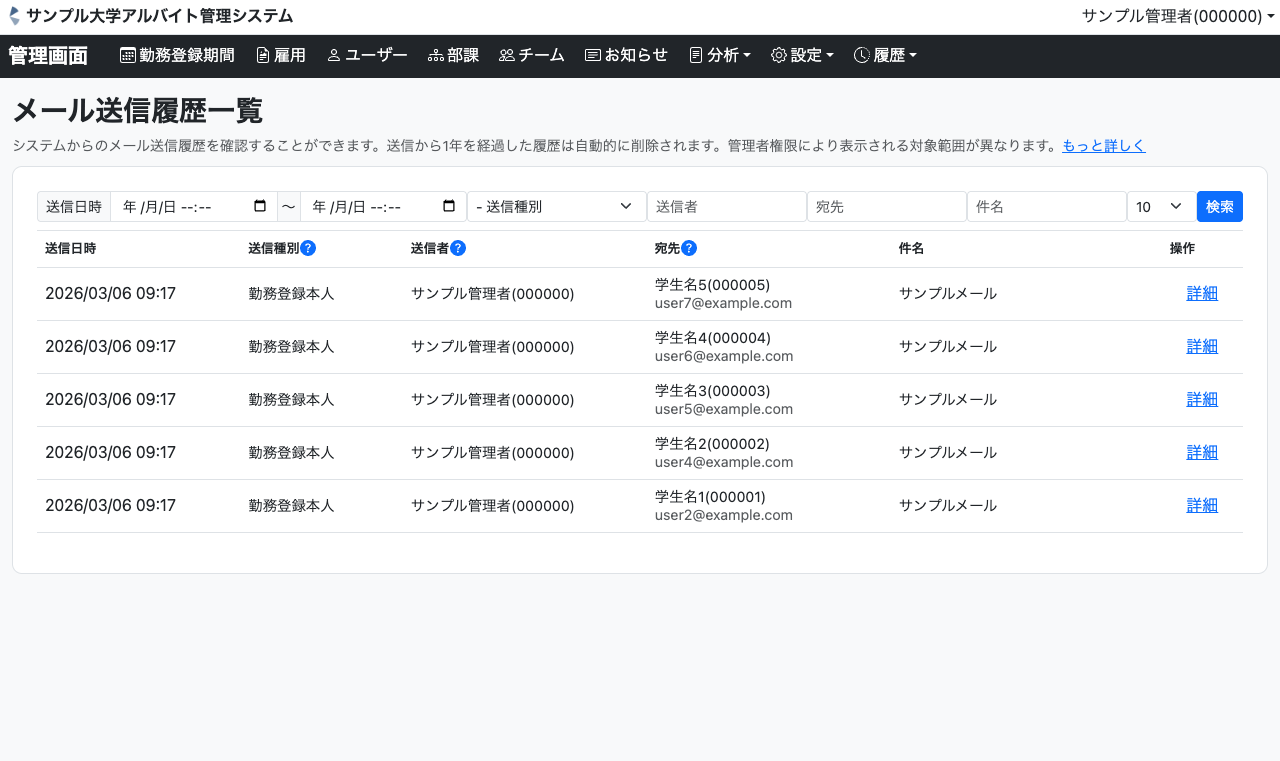 システムを通じて送信されたメール送信履歴を確認できる画面です。権限により表示範囲が異なり、自分が送信したメールの参照はもちろん、誰がいつどのようなメールを送っているかの状況把握が行えます。